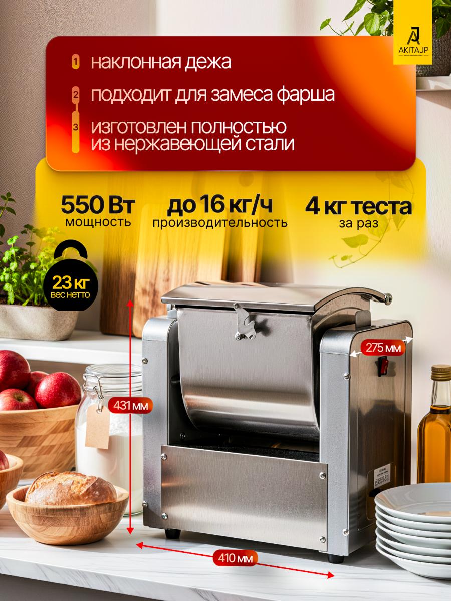 Горизонтальный (как AKITAJP HO-5): Лучше подходит для крутого, плотного теста (пельменное, дрожжевое для хлеба), фарша. Принцип действия обеспечивает более тщательное вымешивание клейковины.